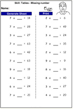 Samples: Identifying the dividend. 2x-10x tables (missing number). Dividing two-digits by one-digit (missing number).